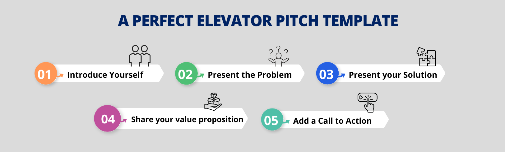 Just like the elevator pitch narration, the purpose of the slides is to give clear and crisp information. Thus, your elevator pitch deck mustn't be full of too many slides. The number of slides for an elevator pitch deck is usually restricted to anywhere between 3 to 8 slides.