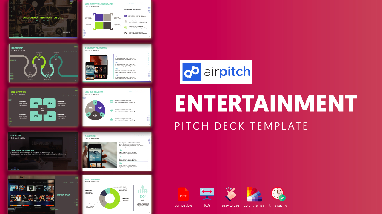 10. Entertainment – The entertainment industry encompasses film, television, radio and print to produce movies, TV/ radio shows, news, music for generating value. This template has modern and creative design with Baskerville & Roboto (free font) to entice investors for brands to shine in the show business.